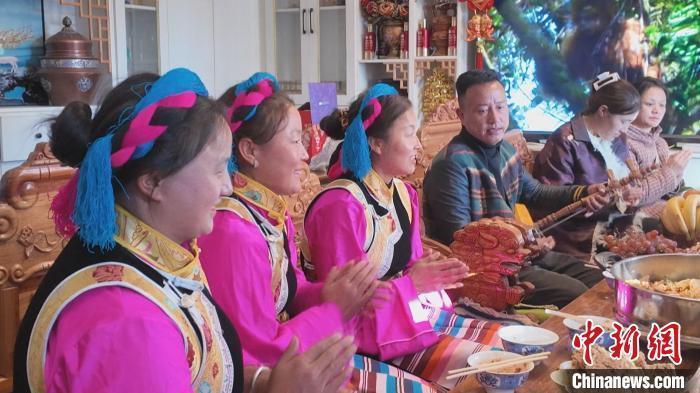 2月27日,四川巴塘南戈水电移民新村,村民拉起弦胡迎接藏历新年。(巴塘县融媒体中心供图)